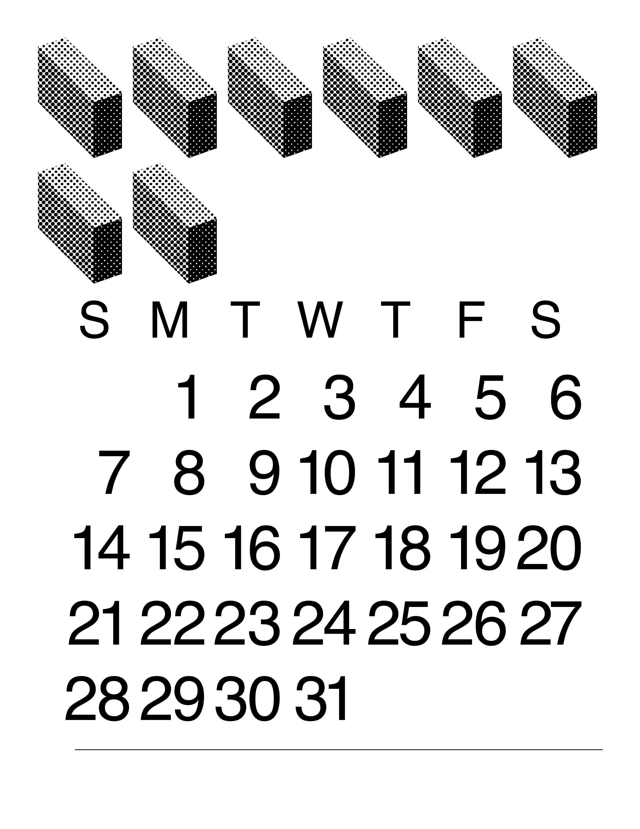 Calendiary (08/22–) is a project centered on a digital template which will be printed monthly on a single sheet of letter-sized paper. The back of the previous month, displayed adjacent, becomes an ongoing record of the current month. These will ultimately be stored in chronological order for an indefinite period.